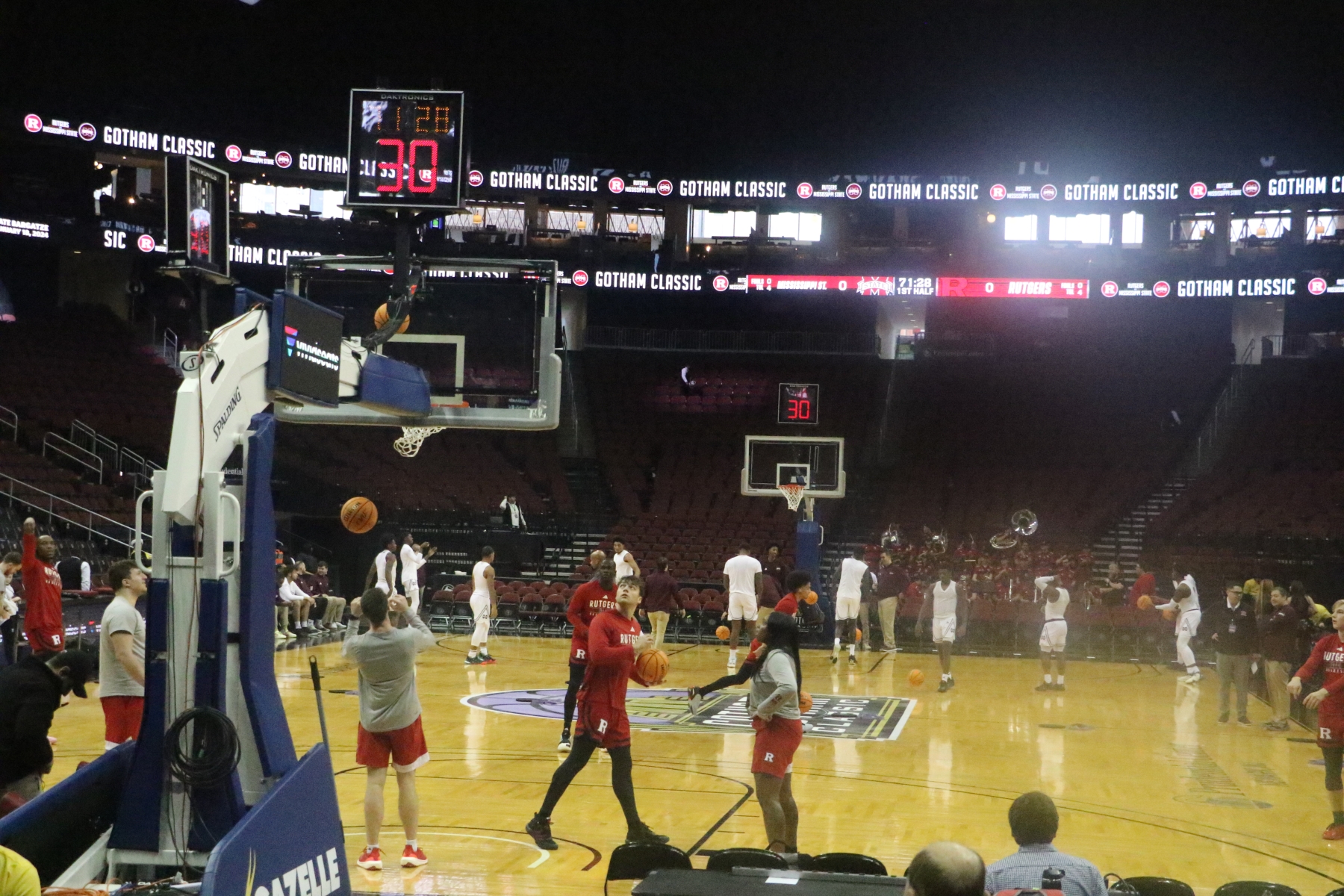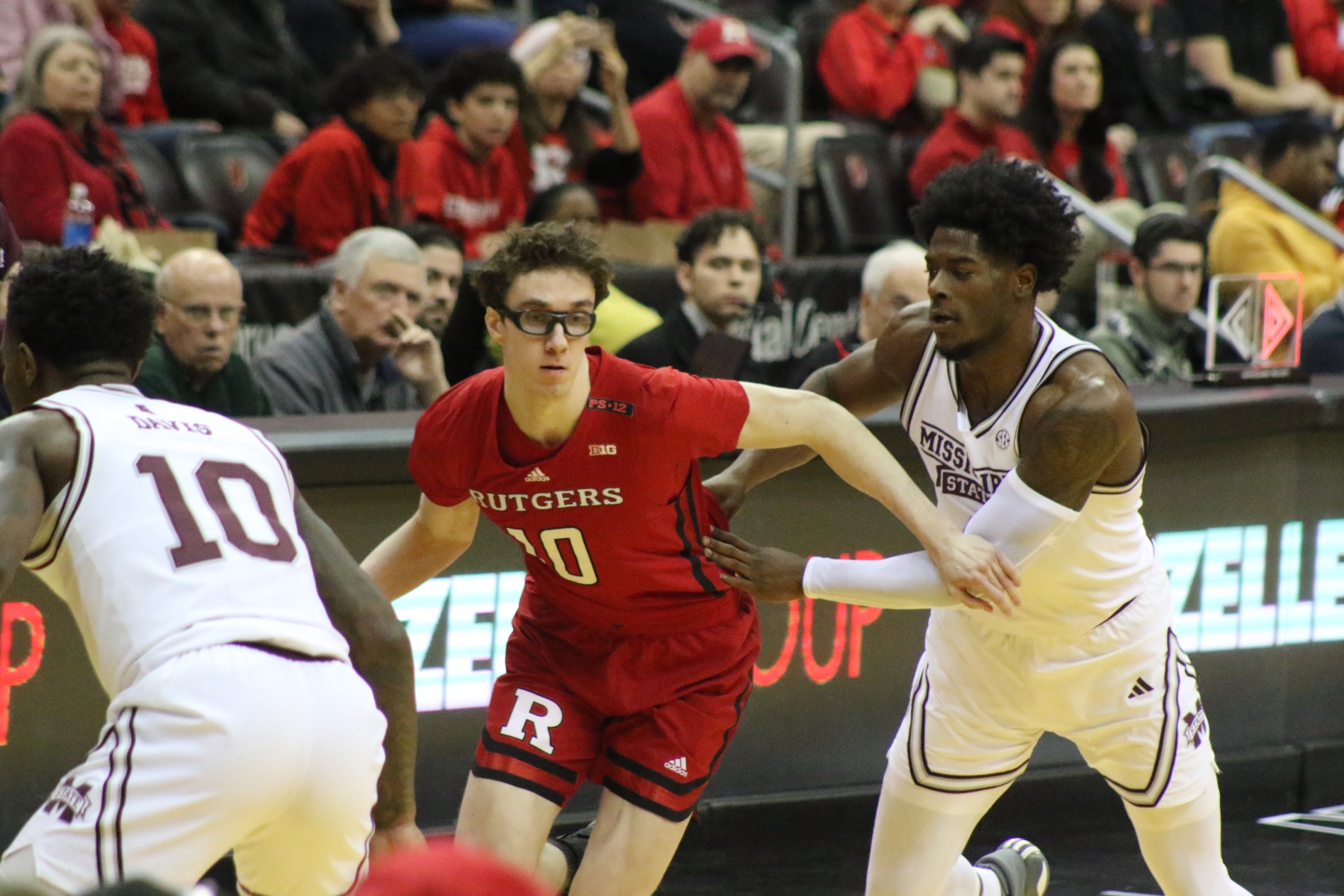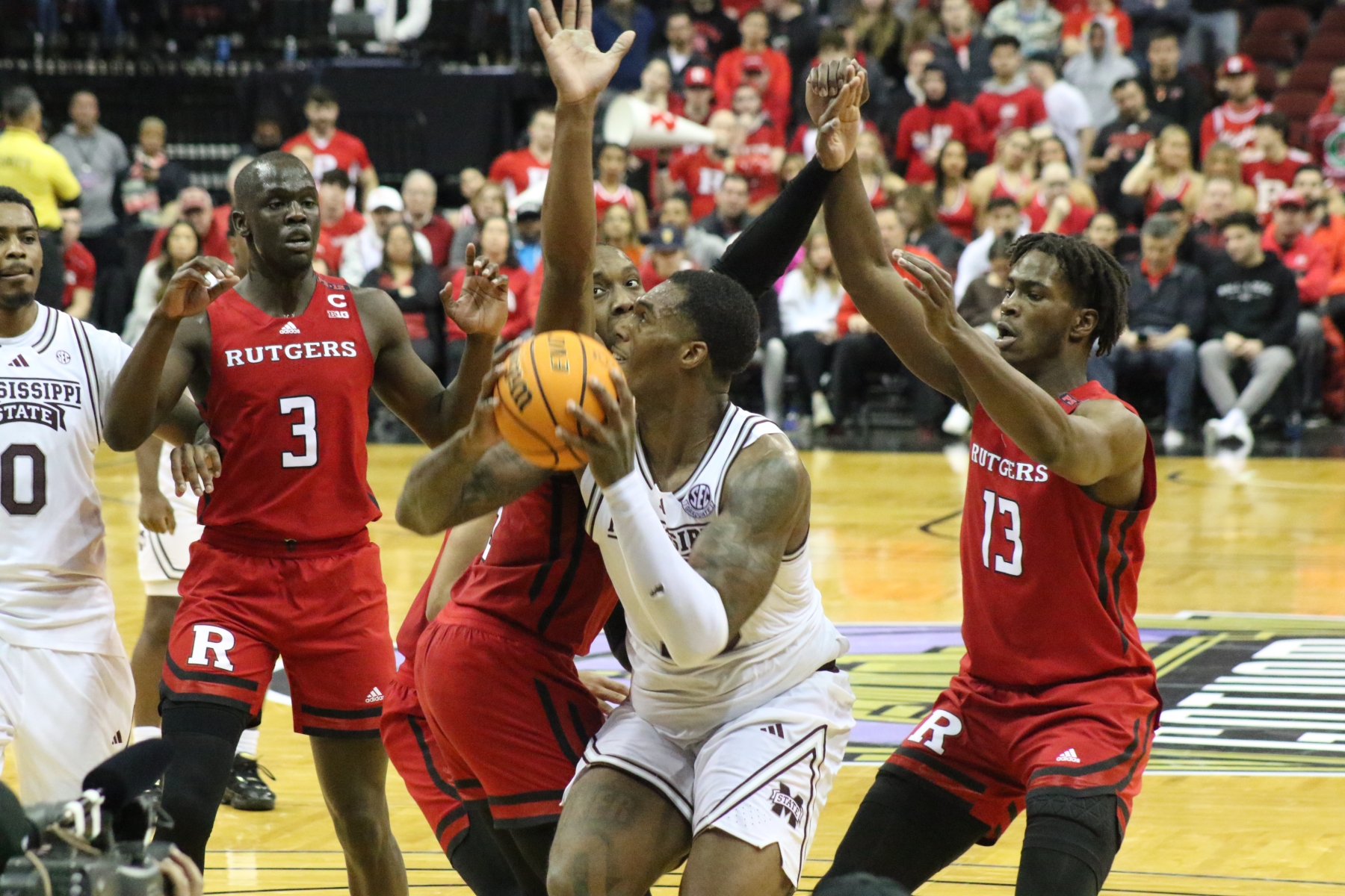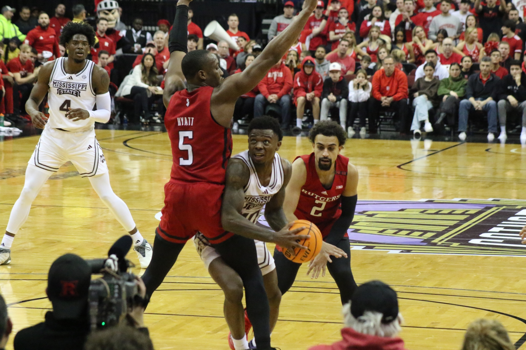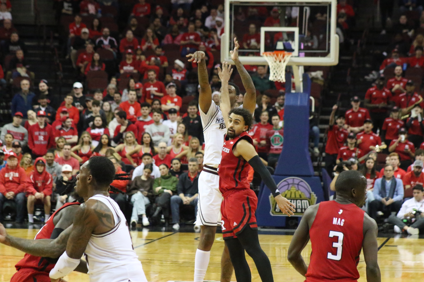 Rutgers playing behind a Prudential Center filled with fans of the Scarlet Knights featured some thrilling moments, including a three-pointer by Aundre Hyatt to get Rutgers and Mississippi State tied at 29 heading into the Half.