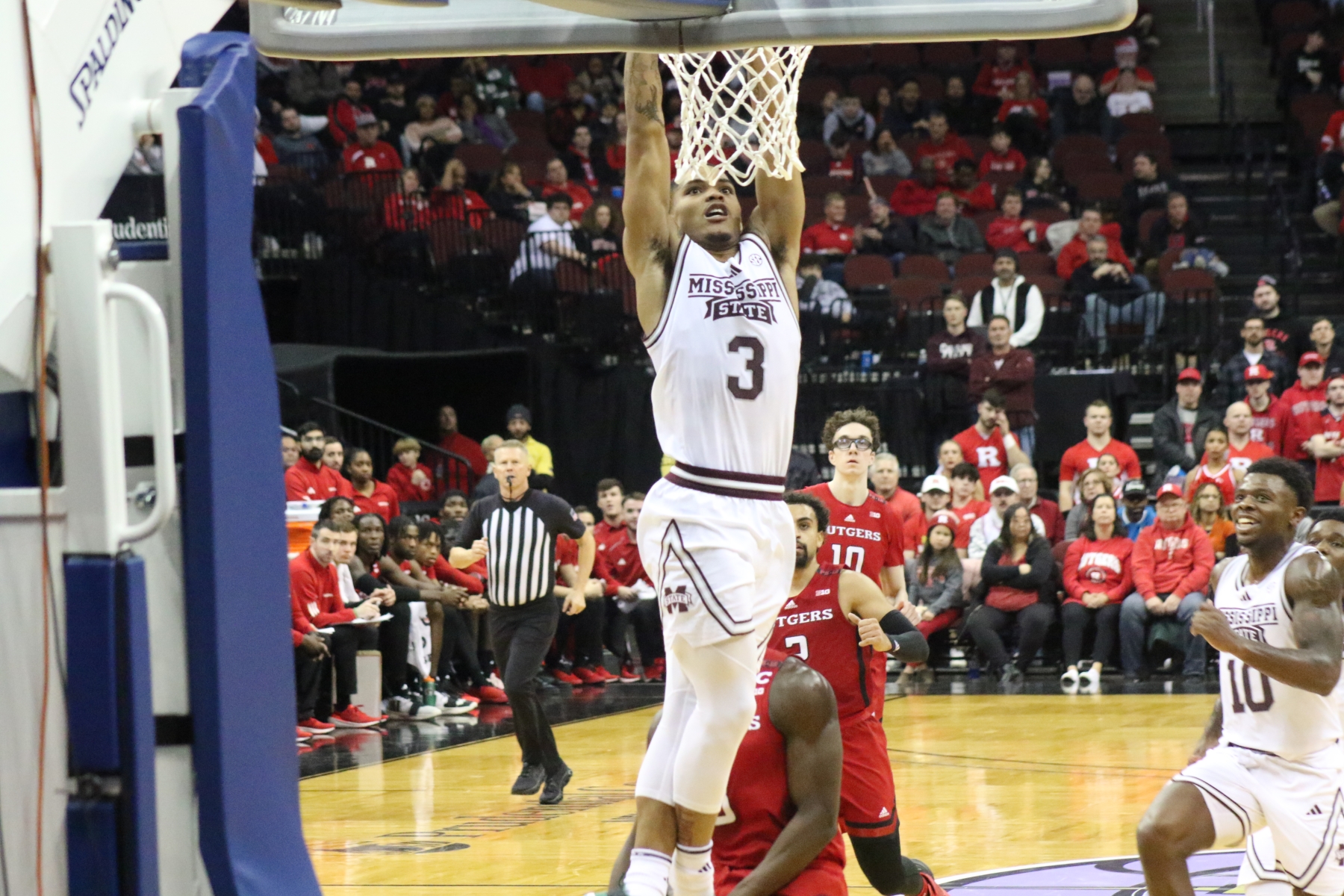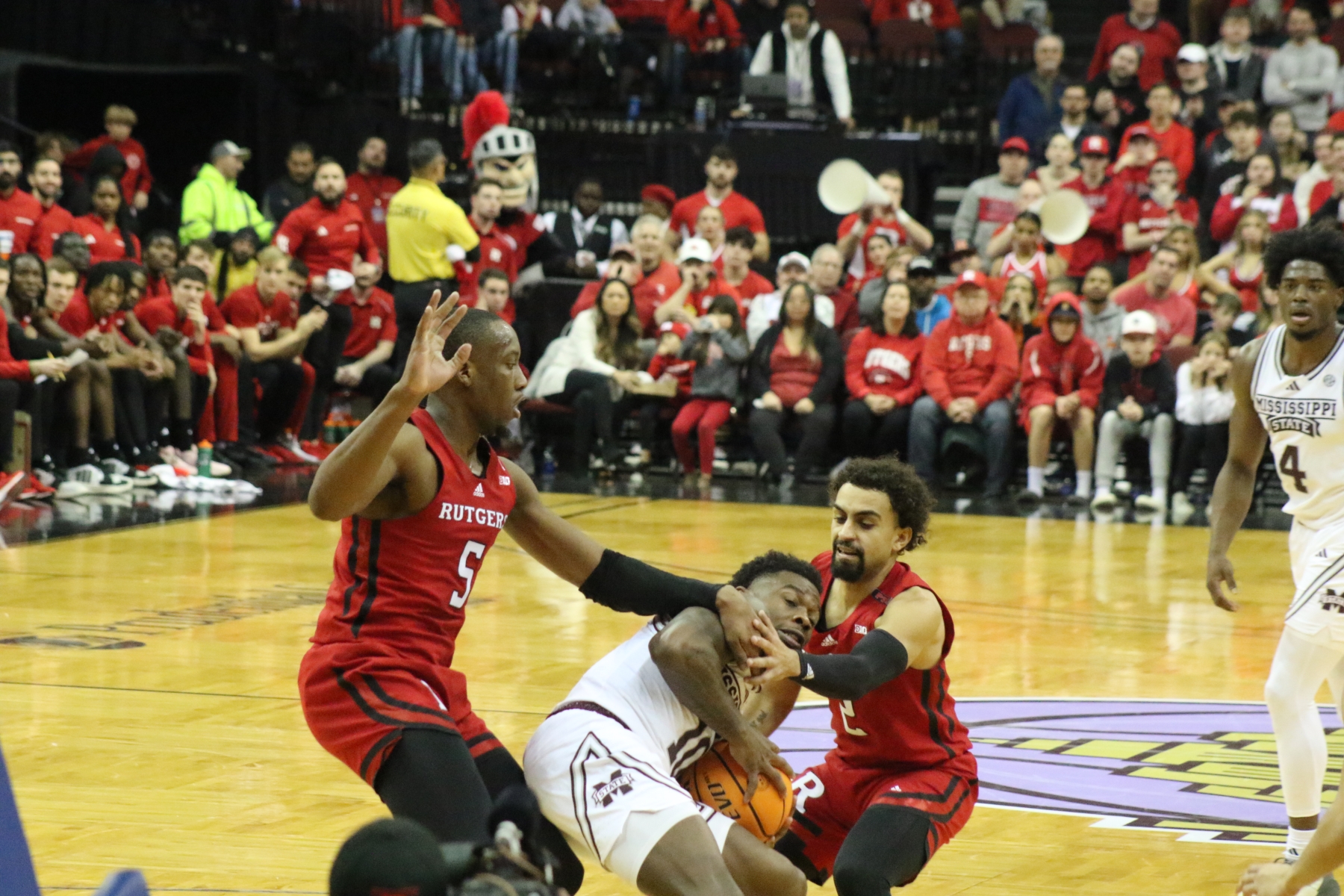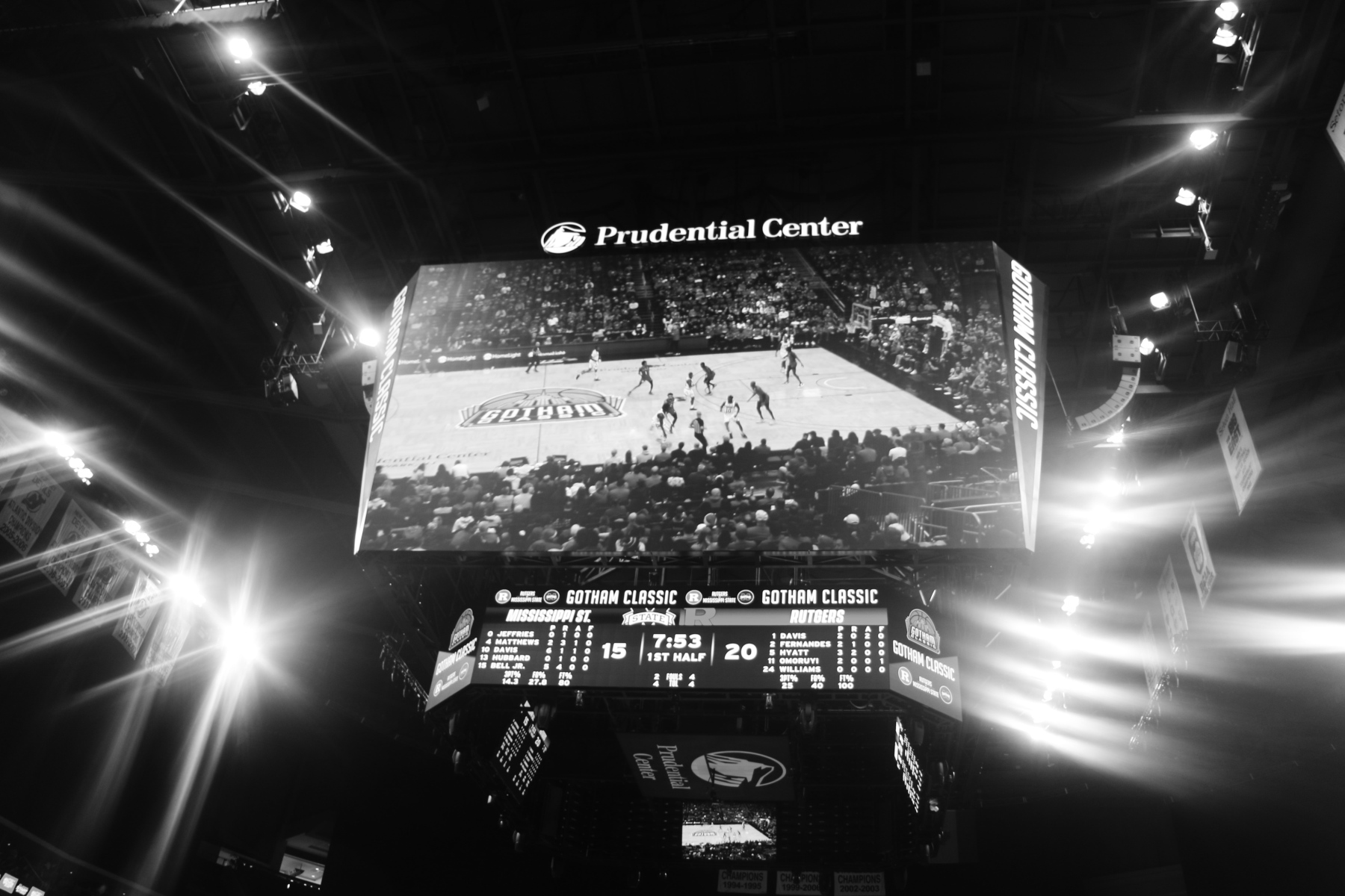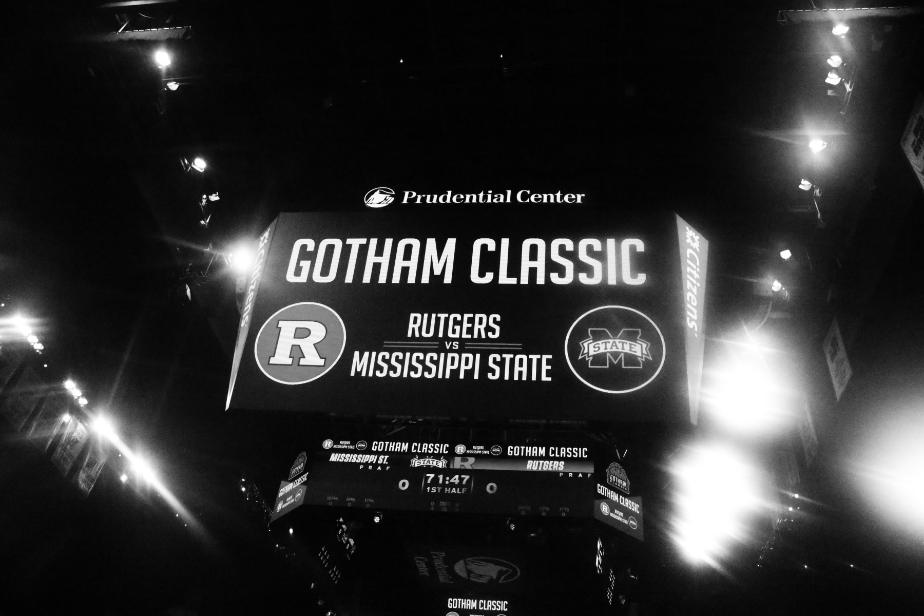 Rutgers playing behind a Prudential Center filled with fans of the Scarlet Knights featured some thrilling moments, including a three-pointer by Aundre Hyatt to get Rutgers and Mississippi State tied at 29 heading into the Half.
